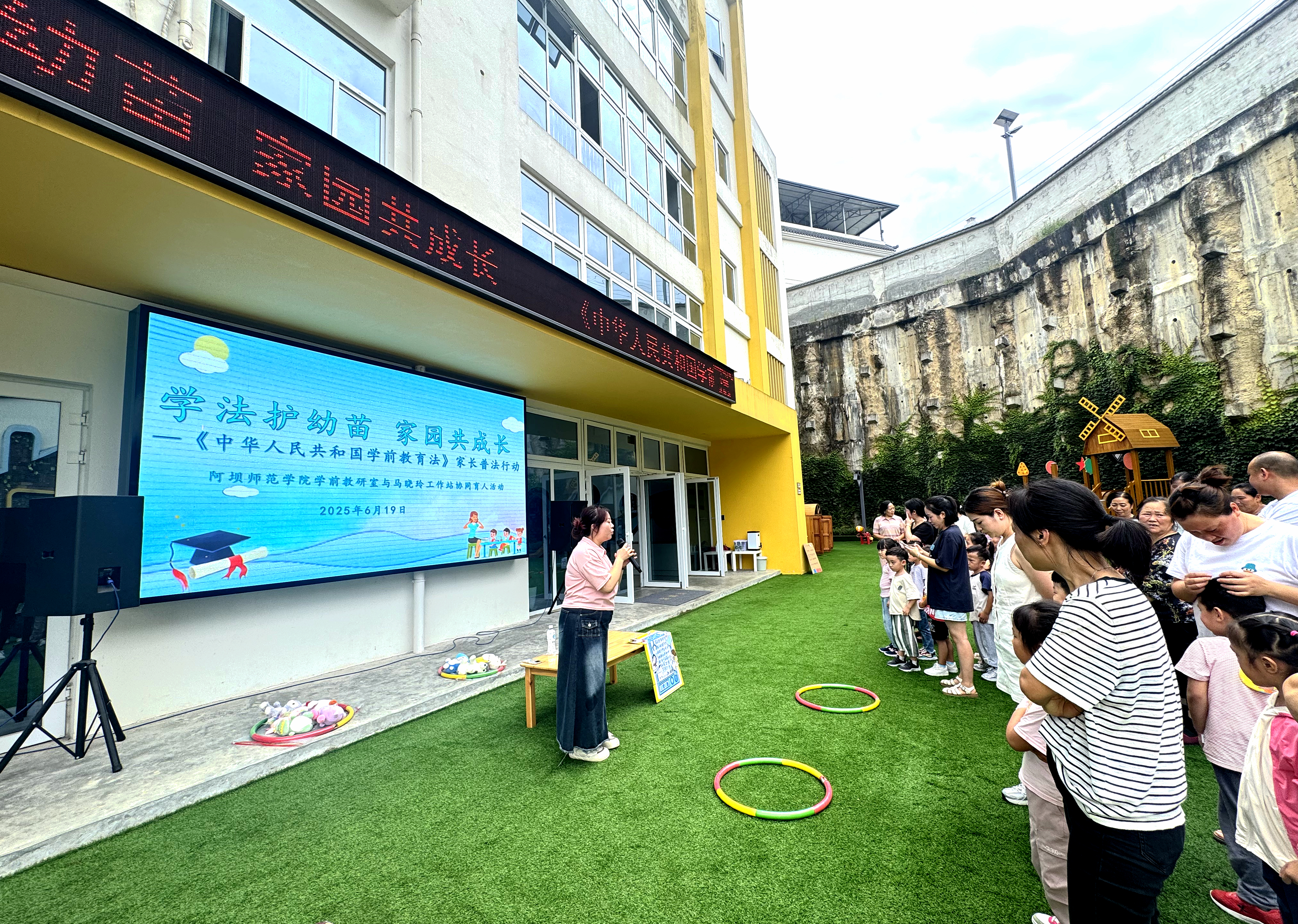 【教院讯】2025年6月19日下午,汶川县第二幼儿园内欢声笑语不断,一场别开生面的“学法护幼苗 家园共成长”——《中华人民共和国学前教育法》(以下简称《学前教育法》)家长普法行动在此热烈开展。此次活动由阿坝师范学院教师教育学院联合汶川二幼马晓玲工作站开展,活动以《学前教育法》于6月1日正式施行为契机,旨在提升家长对该法律的认知,促进家园共育,为学前儿童的健康成长筑牢法律保护网。