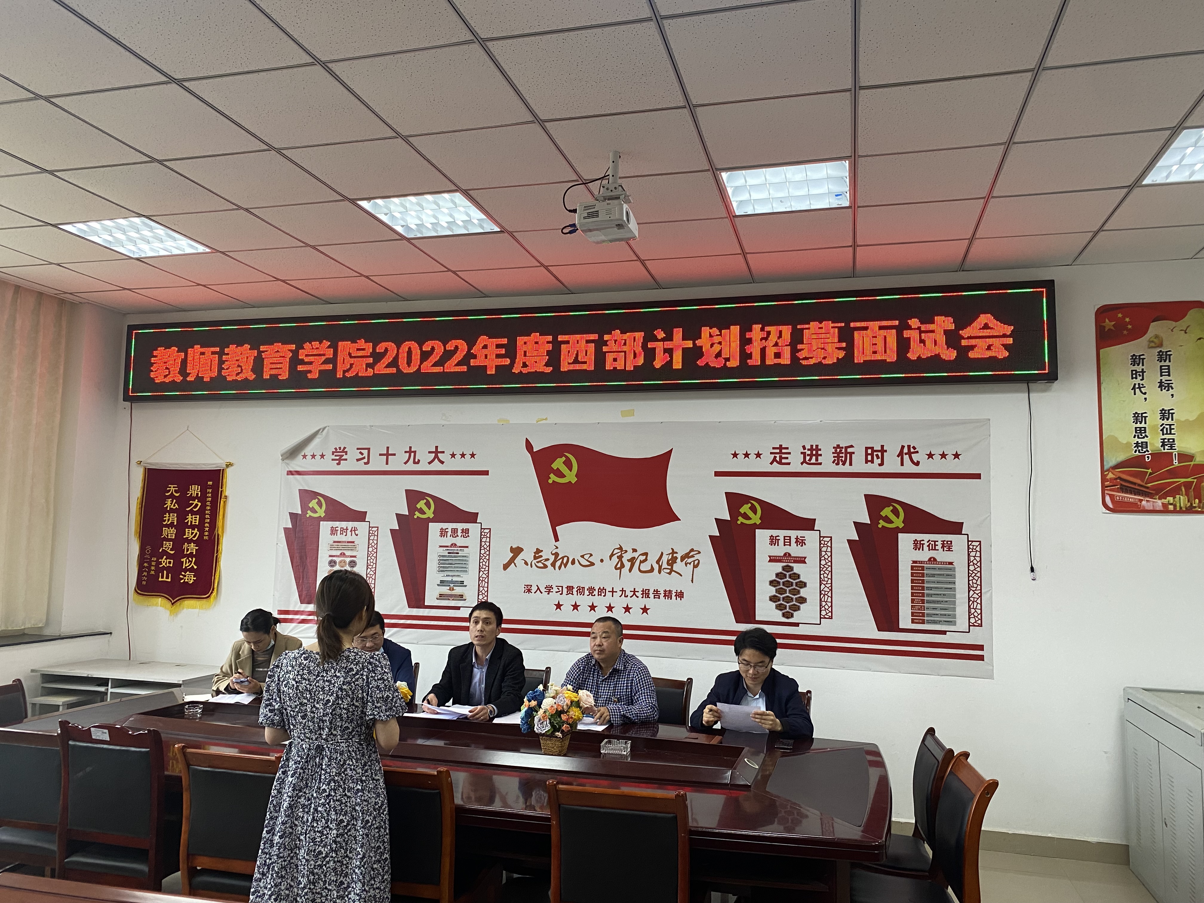【教院讯】为深入学习贯彻习近平新时代中国特色社会主义思想和党的十九大精神,教师教育学院于5月25日16:30在会议室B305成功开展2022年“西部计划”面试选拔工作。面试采取结构化面试的方式进行,由党委书记邓志光、教科办主任黎林烽,王亚、斯郎央章、唐啟瑜老师共同组成面试工作小组,按照相关工作要求开展面试工作。