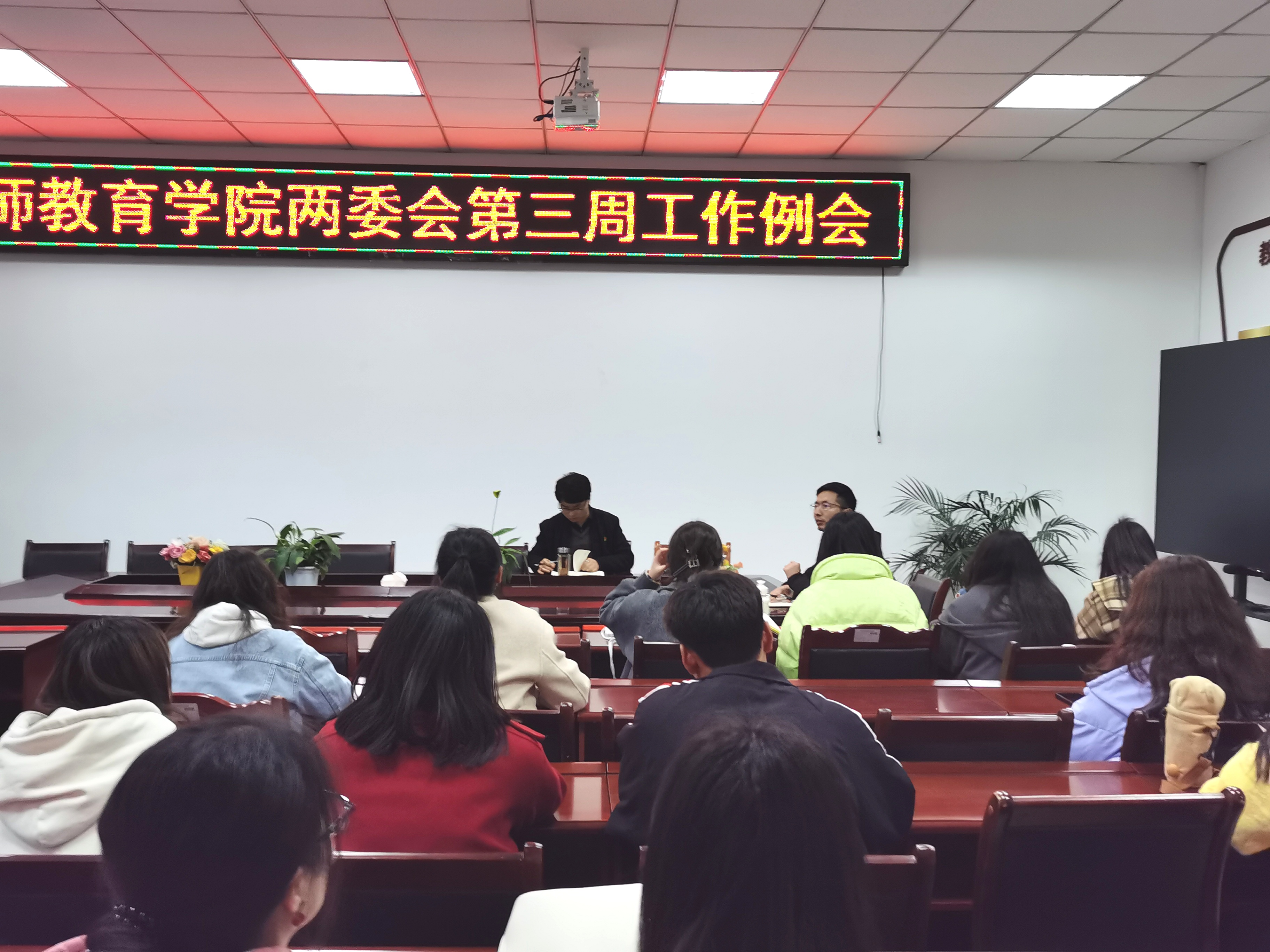 【教院讯】2023年3月7日18:00,教师教育学院两委会在会议室B305召开本学期第三次工作例会,学工办副主任王亚、学院挂职团委副书记王灏及主席团成员、各部门部长、副部长参会。本次会议由魏菡主持。