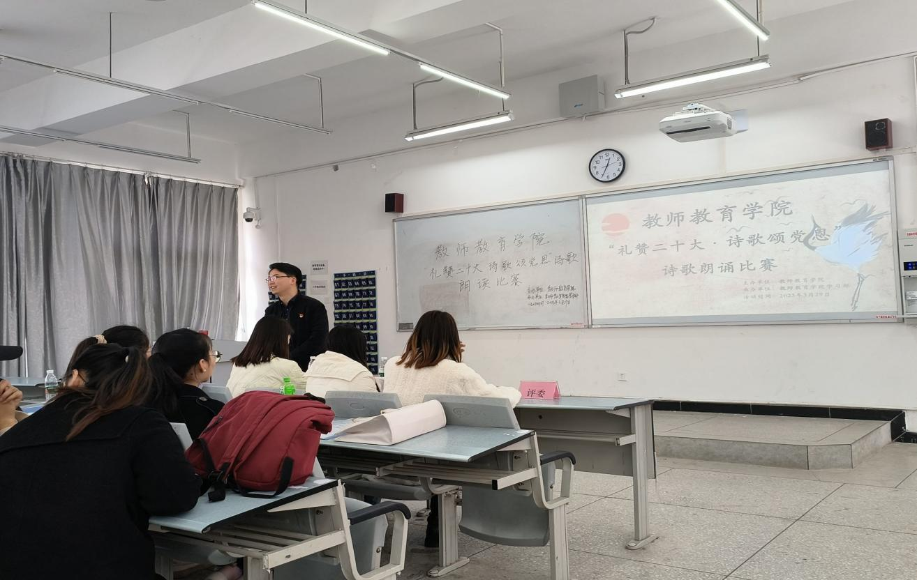 【教院讯】春风拂面,春暖花开,在全国上下深入学习贯彻党的二十大精神背景下,根据《中共阿坝师范学院委员会学生工作部关于开展2023年春季学期学风建设月活动的通知》要求,经过前认真选拨,3月29日12:30教师教育学院在树人楼c202教室成功举办“礼赞二十大·诗歌颂党恩”诗歌朗诵比赛。本次比赛共有二十一组选手参与比赛,学院学工办副主任王亚老师与同学们一起观摩比赛。比赛由张月迪同学主持。