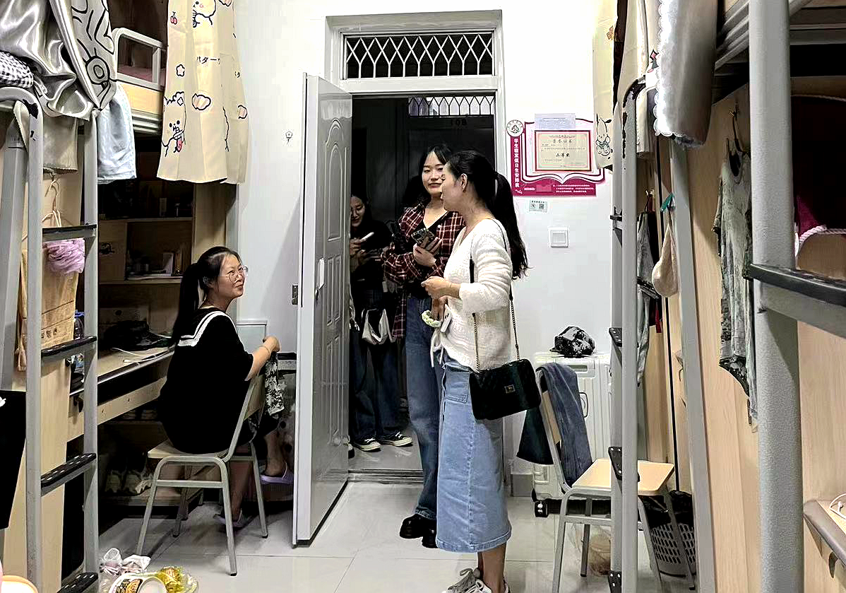 走访过程中,老师们逐一检查宿舍的卫生情况,叮嘱学生要提高安全防范意识,保护好个人私人物品。徐雨薇老师强调,宿舍卫生是平稳学习的条件,宿舍安全是宿舍生活的第一基础,她提醒同学们严禁使用违章电器,杜绝私拉电线,排除寝室存在的安全隐患,保持宿舍卫生常态化。同时,韩莹老师亲切回答同学们各方面问题,提醒大家要保持作息规律,合理规划学习时间,有困难及时反馈,多与辅导员沟通交流,她叮嘱同学们注意预防疾病,做好寝室个人卫生,鼓励同学们尽快适应当前的学习生活。