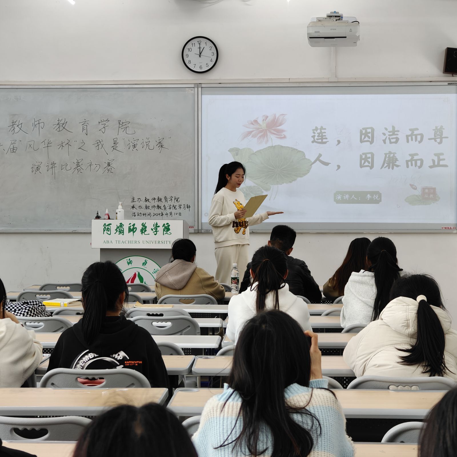 本次比赛教师教育学院广泛宣传,吸引众多优秀选手参赛。选手们着装整洁,仪表大方,紧扣廉洁主题,借助身边生动故事,阐明了廉洁文化的关键意义及日常践行要求。各选手演讲风格各异,有的激情澎湃,有的娓娓道来,有的风趣幽默,但都充满了感染力。他们满怀热忱,以精彩绝伦的演讲,深入诠释了对廉洁文化的独到见解。现场气氛热烈,观众们被选手们的精彩表现所吸引,不时爆发出热烈掌声。