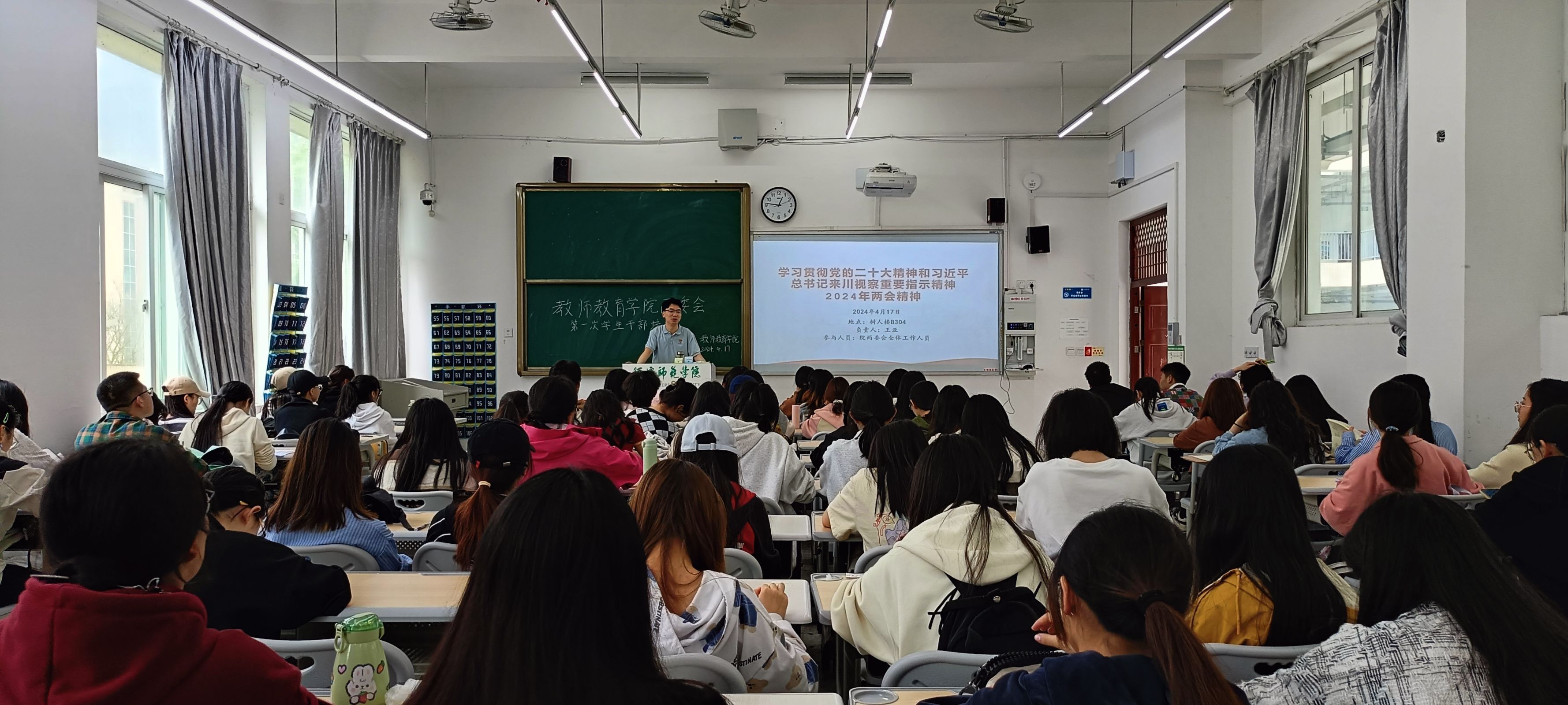 在一个半小时的培训里,王老师首先带领学生干部一起学习了党的二十大精神、习近平总书记来川视察重要指示精神、2024年全国“两会”精神等主要内容。之后,王老师就近期召开的全国“两会”进行了重点领学,期间,王老师结合学生干部发展实际,就如何将重要精神转化为推动学校发展和个人成长的动力进行了重点讲解。他指出,学生干部是学生群体的中坚力量,参会同学要充分结合工作实际,将国家重大决策部署与日常工作、个人成长紧密结合起来,坚定理想信念,提高思想觉悟,积极参与各类素质教育活动,将学习成果转化为服务同学、干事创业的热情和动力。最后,王老师号召全体学生干部要认真学习贯彻落实党的二十大精神、习近平总书记来川视察重要指示精神、2024年全国“两会”精神,在个人成长、学校发展和社会进步中贡献青春力量。