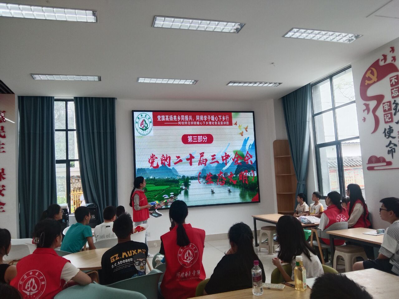 7月16日9点,宣讲团在街村党群活动中心一楼举行了简短的开班仪式。开班仪式开始,全体人员肃立,奏唱国歌,街村党支部副书记刘琴、教师教育学院老师王亚及志愿者代表王婷分别讲话,最后,全体参会领导、老师和同学们合影留念。