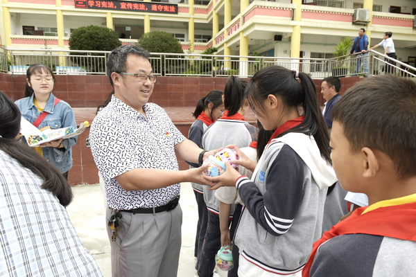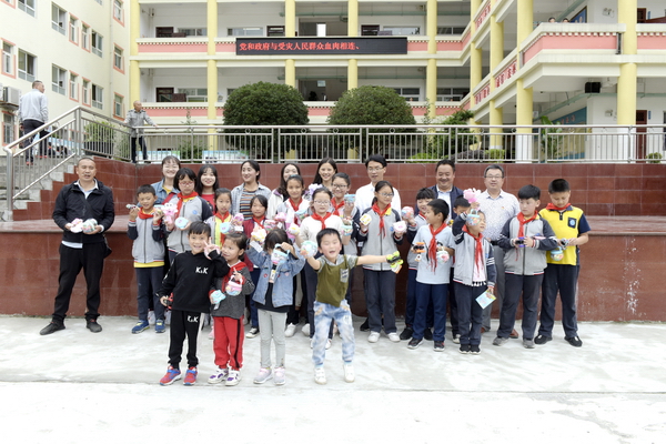 随后,邓书记一行与在三江小学安顿的邓家村学龄儿童亲切交流,随行的学生代表把小朋友们逗得哈哈大笑,与他们一起玩玩具,帮助小朋友们纾解了心中的紧张和压抑。在轻松愉快的氛围中,邓书记为小朋友们发放了精心挑选的礼物。