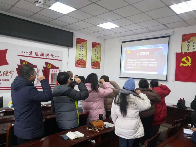 许书记宣布大会开始,全体同志起立,奏唱《国际歌》。之后,许书记代表第一党支部全体党员同志,欢迎斯郎央章、王蕾两位同志加入党组织。紧接着,许书记领誓,全体同志举右手握拳面向党旗宣誓。斯郎央章、王蕾同志分别向党组织表明入党决心并汇报自身近期工作、生活及思想动态情况。二位同志均表示:“加入中国共产党是自己的荣耀,愿意为共产主义事业奉献终身,对党忠诚,永不叛党!”