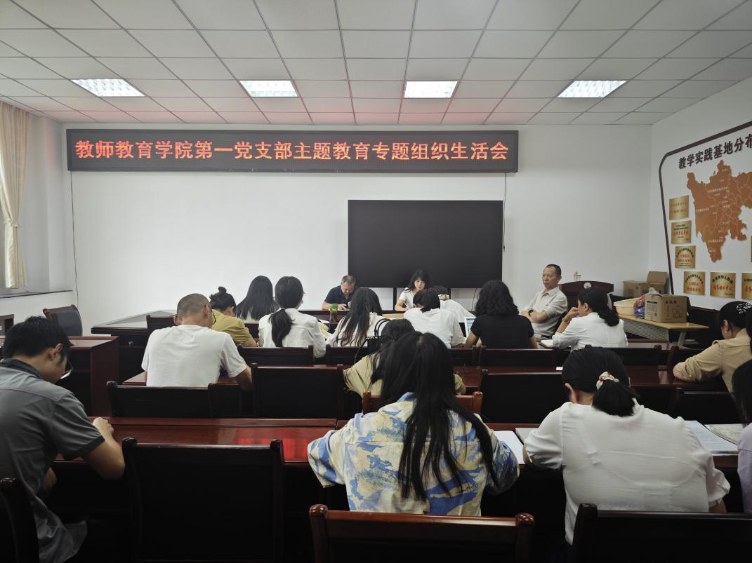 【教院讯】为深入学习贯彻习近平新时代中国特色社会主义思想,9月13日下午3点30分,教师教育学院第一党支部在B305会议室召开主题教育专题组织生活会。会议由第一党支部书记许春蓉同志主持,第一党支部全体党员同志参加了会议。