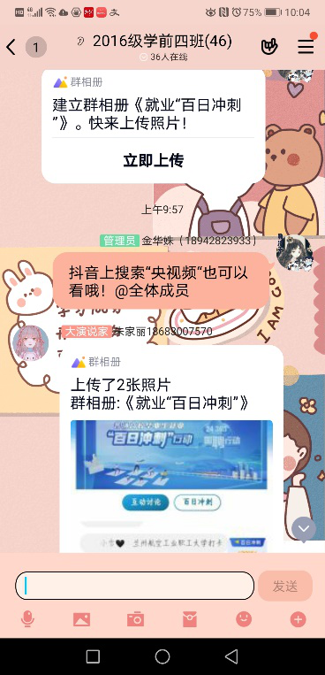 之后,各班毕业生积极互动。2016级学前本4班的36名毕业生观看本次网络直播后,将学习截图发在班群相册与其他同学积极分享。同学们对这次央视举办的就业活动十分积极,就业热情高涨,并希望借机解开自己心中的就业谜团,也希望本次活动能够帮助自己更好地走向工作岗位。2016级学前本2班的37位毕业生也在央视频app上认真观看了此次直播。他们表示:通过观看高校专家、央企代表、毕业生代表对就业热点问题的讨论,对自己的就业有了更加清楚的认识。另一方面,牧原集团、酒钢集团、明阳智慧能源集团股份公司3家企业参与首日线上云宣讲,提供了大量的就业岗位,拓宽了大家的就业渠道。