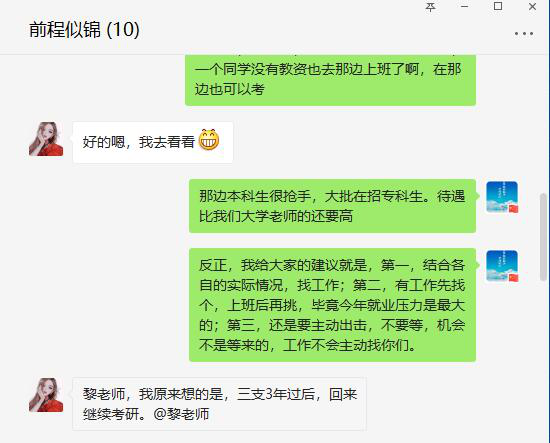 有的老师通过建立微信群,联系所对接的同学,对其进行就业情况的了解和帮扶,一起交流相关就业问题等。有的老师为了提供更精准的就业服务,针对家庭困难学生进行一对一帮扶。成立专门的帮扶小组,组长由老师担任,从已就业同学中挑选10位素质能力佳的同学作为助手协助老师的工作。帮扶小组采用“二对一”(老师+学生助理帮扶一个人)的方式。灵活运用“一周一总结,两周一汇报”的方式在钉钉群开会总结汇报。对困难毕业生进行就业观念、就业能力、就业信息的系列帮扶服务。