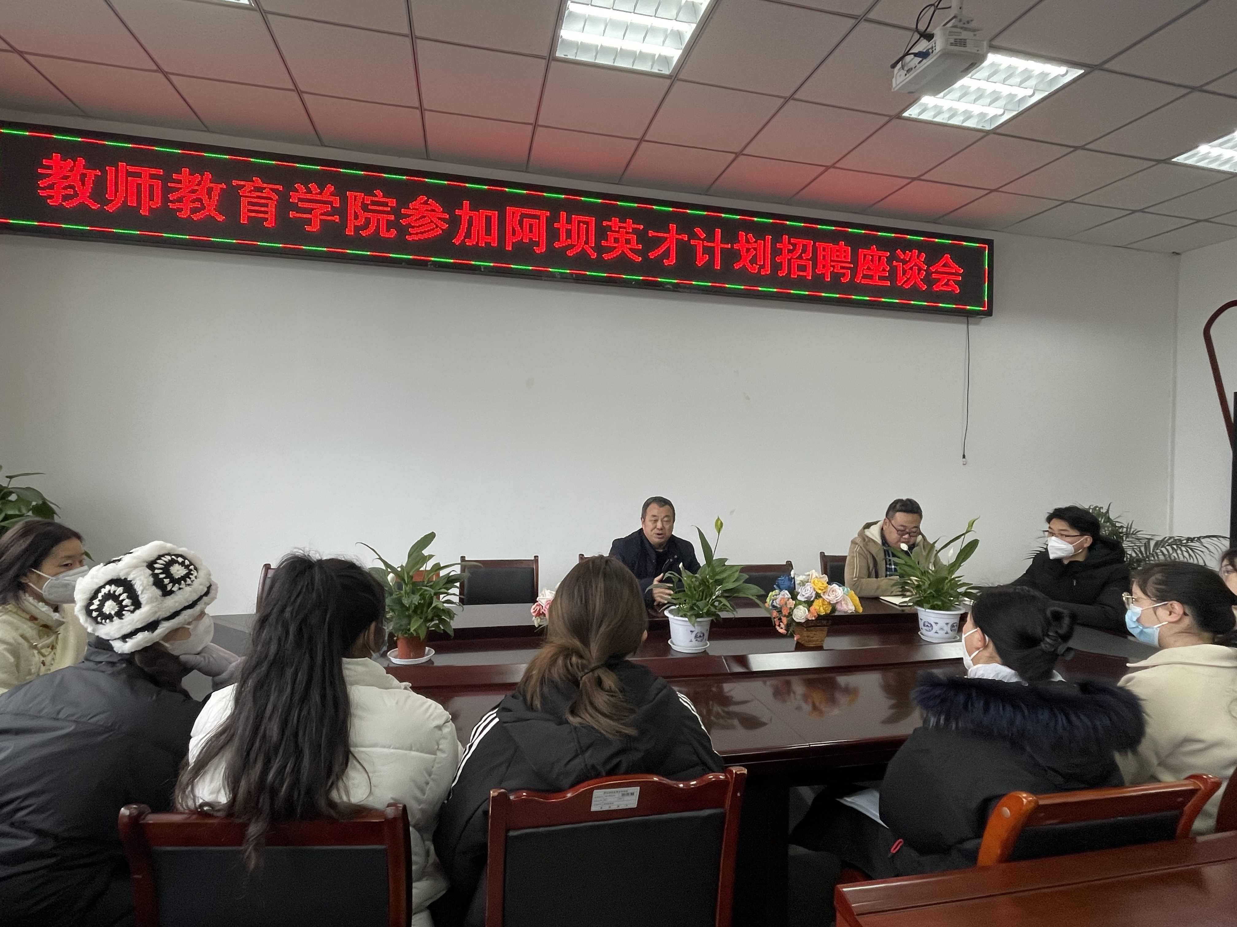 【教院讯】2023年1月3日,由中共阿坝州委组织部、阿坝州人力资源和社会保障局、阿坝州教育局共同主办,阿坝师范学院承办的“‘阿坝英才计划’阿坝州2022年事业单位紧缺人才招聘会”在学校体育馆举行,教师教育学院积极组织2023届毕业生现场参与应聘。学院党委书记邓志光,就业干事王亚、李明星,班主任代表顾鹏、华尔么、龚维馨等老师现场指导。与此同时,为及时了解毕业生现场就业动态、具体困难,及时提供科学精准指导服务,1月3日14:30学院邀请达日拉姆、刘刚艳、何琴等10余名现场应聘毕业生,在B305会议室举行2023届毕业生“阿坝英才计划”应聘座谈会,会议由邓书记主持。