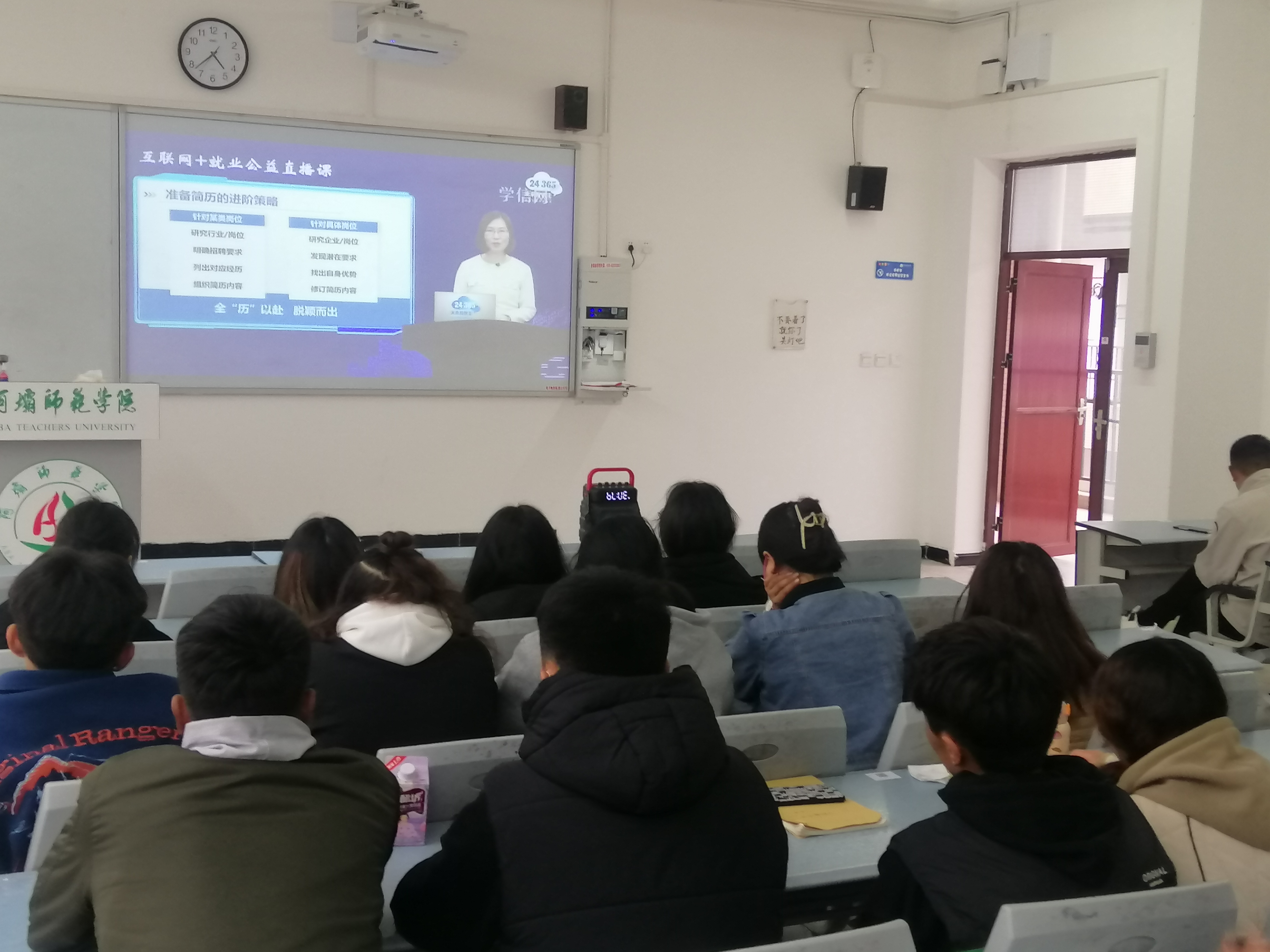 3月14日下午,教师教育学院组织2021级小教五年制1-4班在C402教室收看教育部“互联网+就业指导”公益直播课。本次直播课的主题是“毕业生求职准备进阶策略”。本次直播课由中国石油大学(华东)学生就业指导中心副主任、副研究员赵晓珂老师担任主讲。学院就业干事王亚、班主任顾鹏老师与50余名未落实工作的毕业生一同观看。