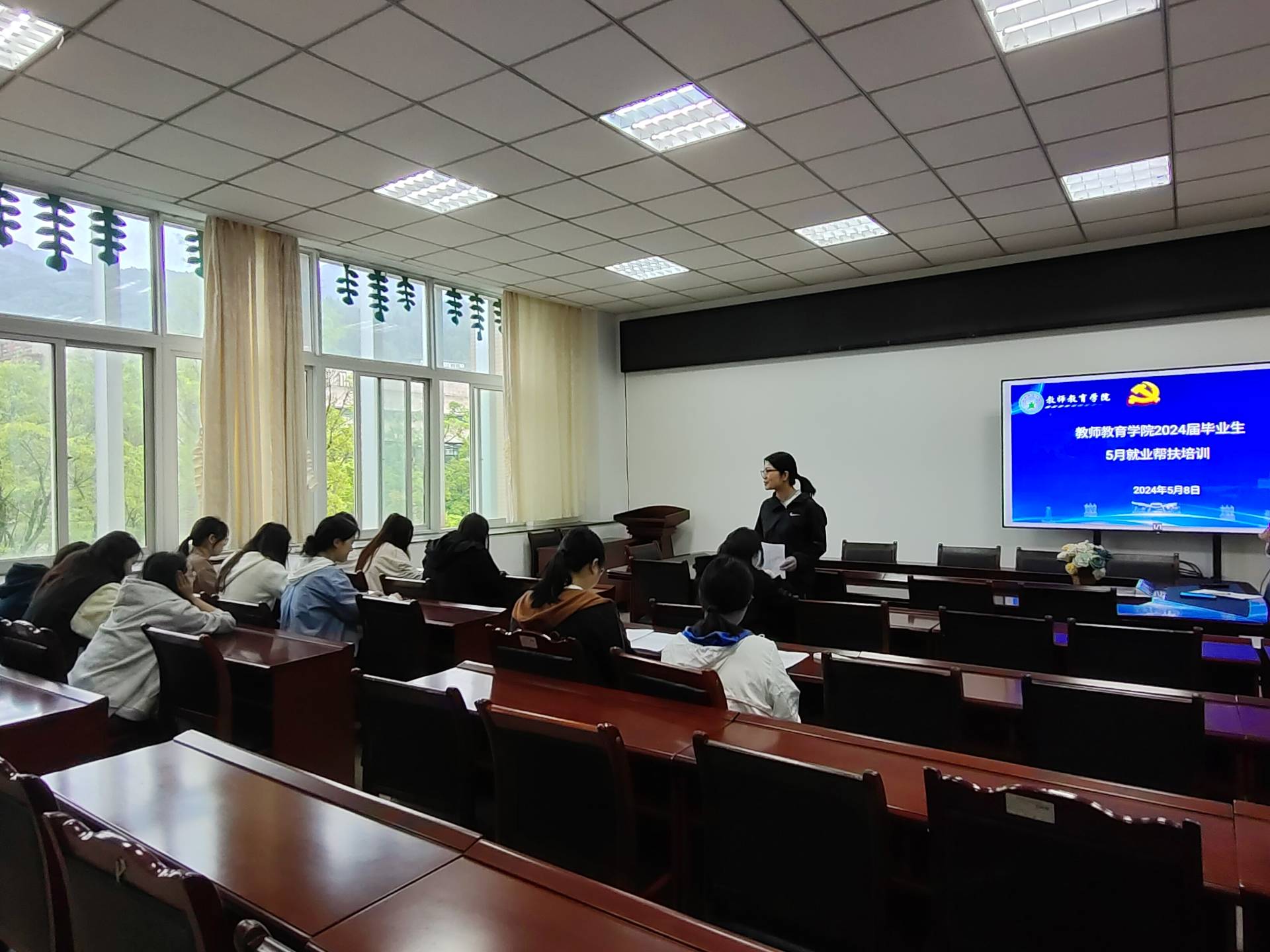 【教院讯】就业是第一民生,在全国上下学习贯彻党的二十大精神背景下,在学院全力以赴备战师范专业认证背景下,教师教育学院主动作为,积极应对就业压力巨大、毕业生层次多元的2024届就业工作大考,千方百计促进2024届应届毕业生更加充分更高质量就业。在学院2024届毕业生就业领导小组邓志光书记、徐波院长、范燕华副书记、王小琴副院长亲自挂帅和精心筹划下,教师教育学院举办了一系列针对2024届毕业生就业帮扶、指导的专项活动。春天悄然离去,五月如期到来,5月8日学院继续开启新一轮毕业生就业专项帮扶培训。邓书记、范书记莅临指导,王亚老师、华尔么老师、顾鹏老师、龚维馨老师、李明星老师担任主讲,2024届小教、学前专业未落实就业的80余人按时到场上课。