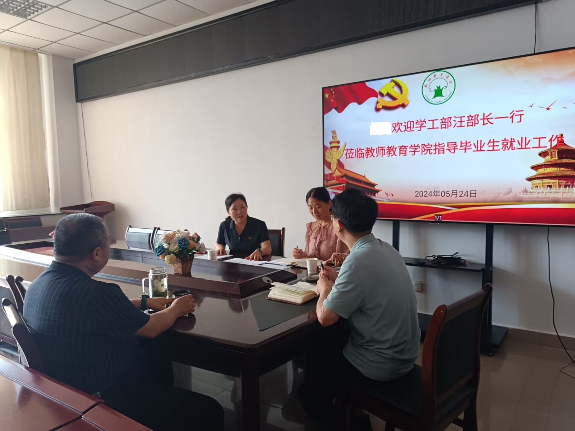 【教院讯】就业是第一民生,根据学校就业工作总体部署,2024年5月24日8:40学校党委学生工作部汪金容副部长、赵媛媛老师一行莅临教师教育学院指导2024届毕业生就业工作,教师教育学院党委书记邓志光、就业干事王亚老师参会。