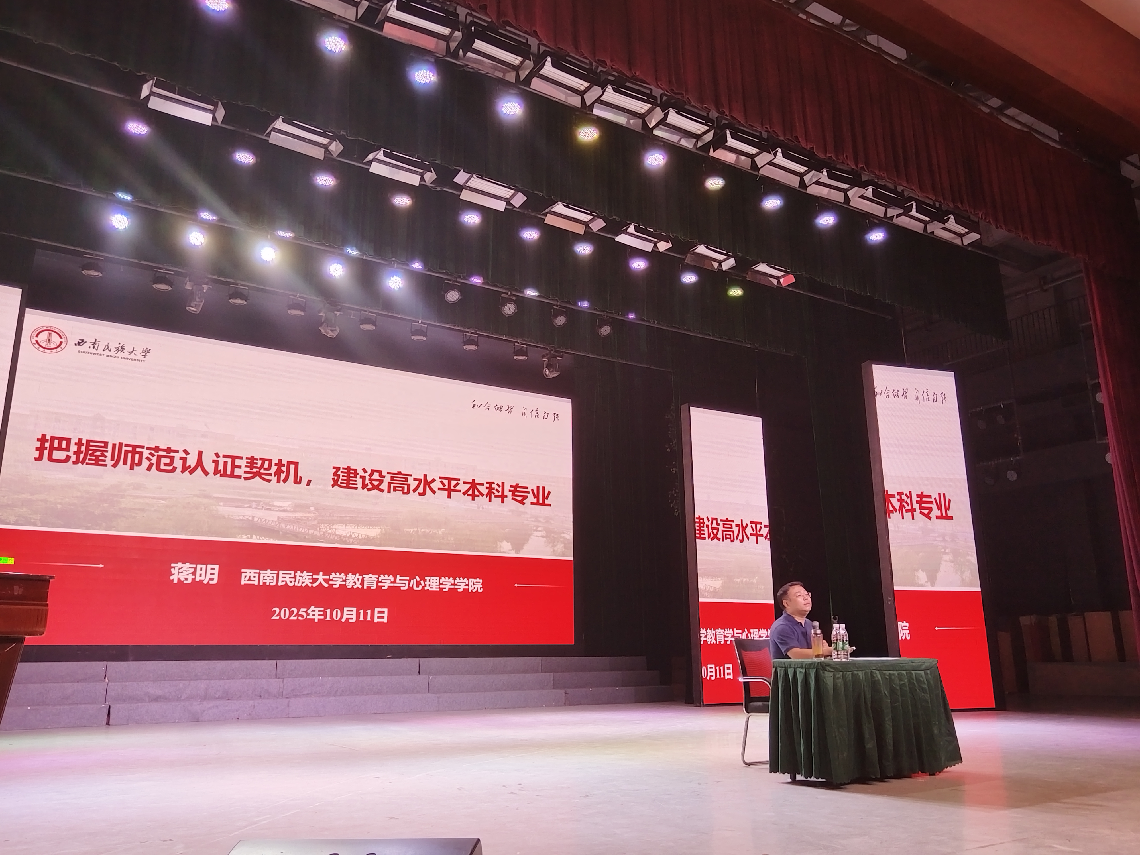 【教院讯】为全力备战小学教育专业二级师范认证,做好迎接师范认证专家来校现场考察各项准备工作,教师教育学院于10月11日14:30在南苑剧场,邀请西南民族大学教育学与心理学学院副院长蒋明博士开展“把握师范认证契机,建设高水平本科专业”专题讲座,全校400余名师生参会。教师教育学院党委副书记范燕华主持讲座。